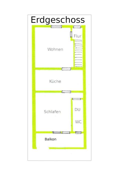 Erdgeschoss: ca.50 m² Wohnfläche, Wohnzimmer, Schlafzimmer mit Südterrasse und Gartenzugang, Küche (Innenbereich), Dusche/WC, Eingangsbereich (Flur).