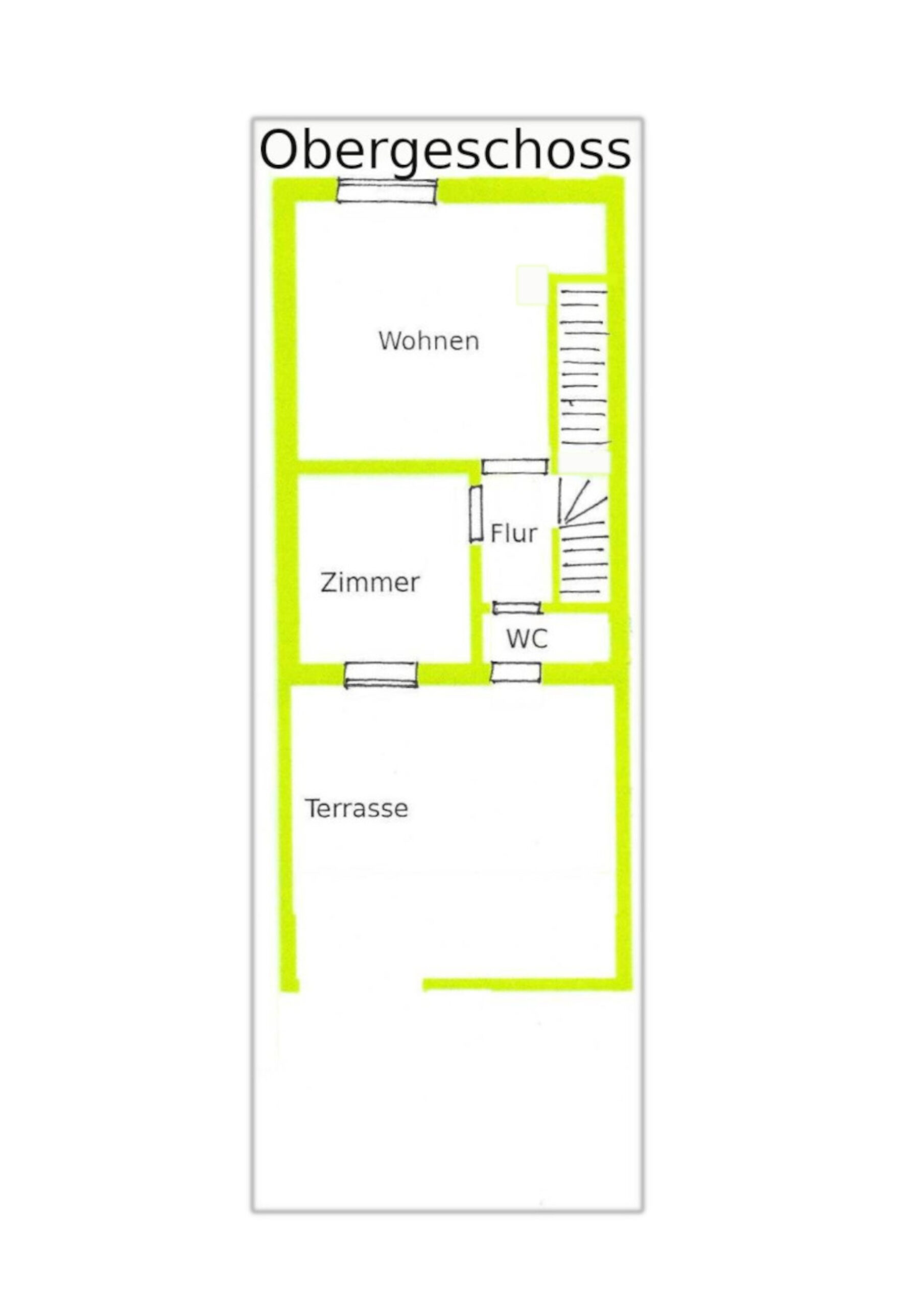 Obergeschoss: ca.38 m² Wohnfläche, 2 Zimmer, Südterrasse, WC.
